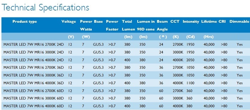 Thông số kỹ thuật bóng đèn Philips Master Led MR 16