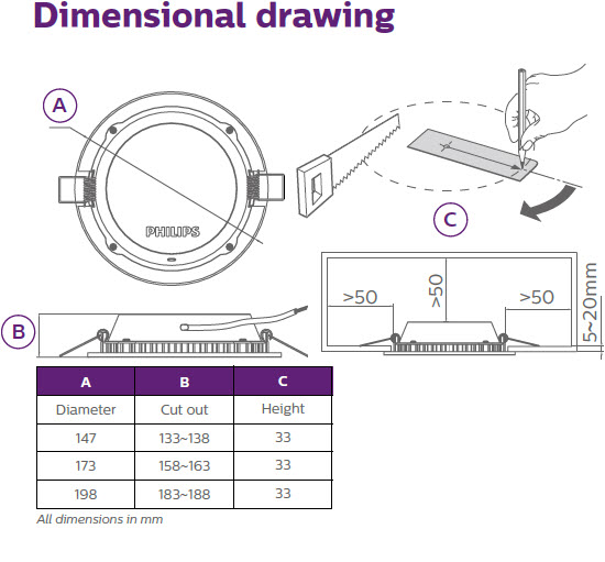Kích thước khoét lỗ bô đèn downlight âm trần Led Philips DN027B