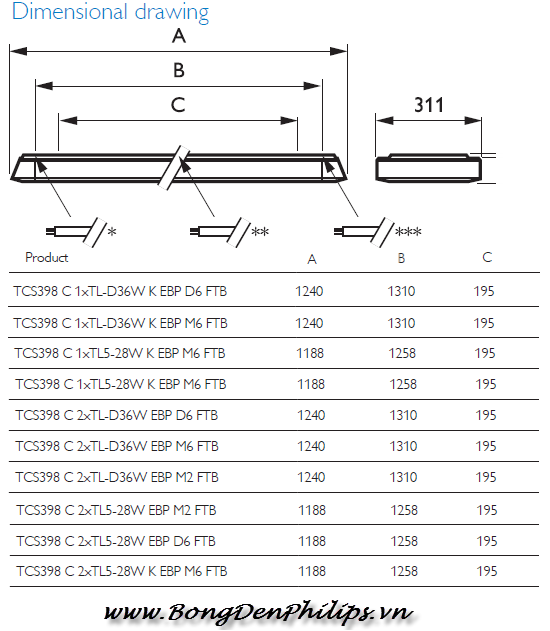 Thông số kỹ thuật bộ máng đèn huỳnh quang Philips 1.2m TCS398